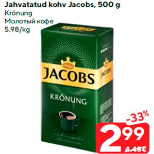 Период кампании: 18.08.2020 - 24.08.2020 Цена: 2.99€ Молотый кофеKrönung Jahvatatud kohv Jacobs, 500 g