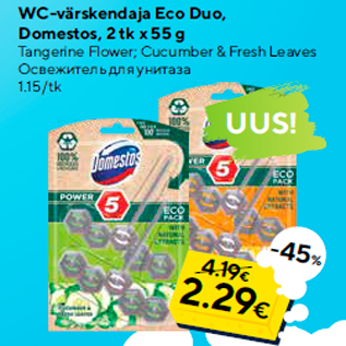 Период кампании: 03.09.2020 - 07.09.2020 Цена: 2.29€ Oсвежитель для унитазаTangerine Flower; Cucumber & Fresh Leaves WC-värskendaja Eco Duo,