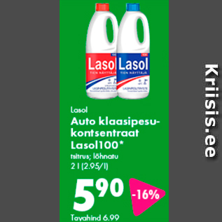 Товар концентрат для мытья лобового стекла lasol lasol 100* продавался со скидкой в магазине Prisma в период с 15.09.2020 по 21.09.2020 по цене 5.90 евро.
