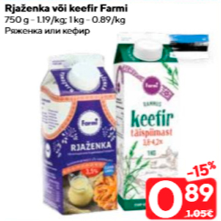 Период кампании: 29.09.2020 - 05.10.2020 Цена: 0.89€ Ряженка или кефир750 g; 1 kg Rjaženka või keefir farmi