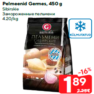Период кампании: 13.10.2020 - 19.10.2020 Цена: 1.89€ Замороженные пельмениSibirskie Pelmeenid Germes, 450 g