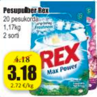 Период кампании: 23.10.2020 - 29.10.2020 Цена: 3.18€ Стиральный порошок Rex20 pesukorda; 1,17 kg / 2 sorti Pesupulber Rex