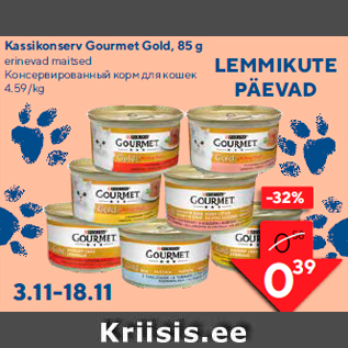 Период кампании: 03.11.2020 - 18.11.2020 Цена: 0.39€ Консервированный корм для кошекerinevad maitsed Kassikonserv Gourmet Gold, 85 g