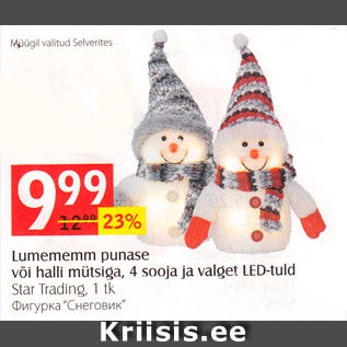 Müügil valitud Selverites Lumememm punase või halli mütsiga, 4 sooja ja valget Led-tuld